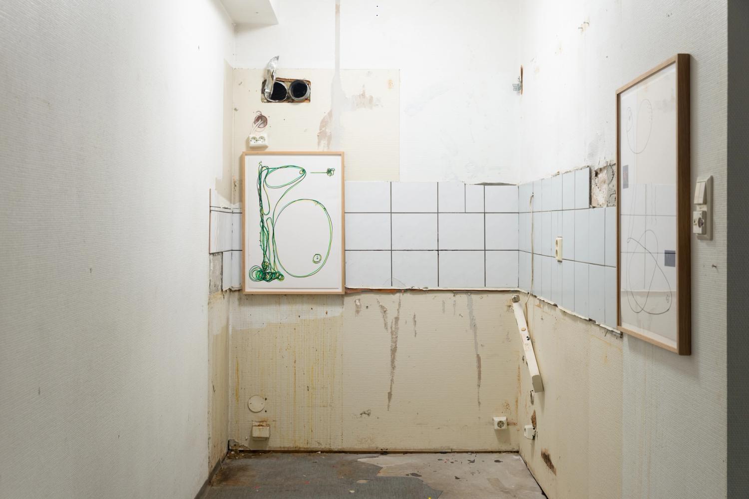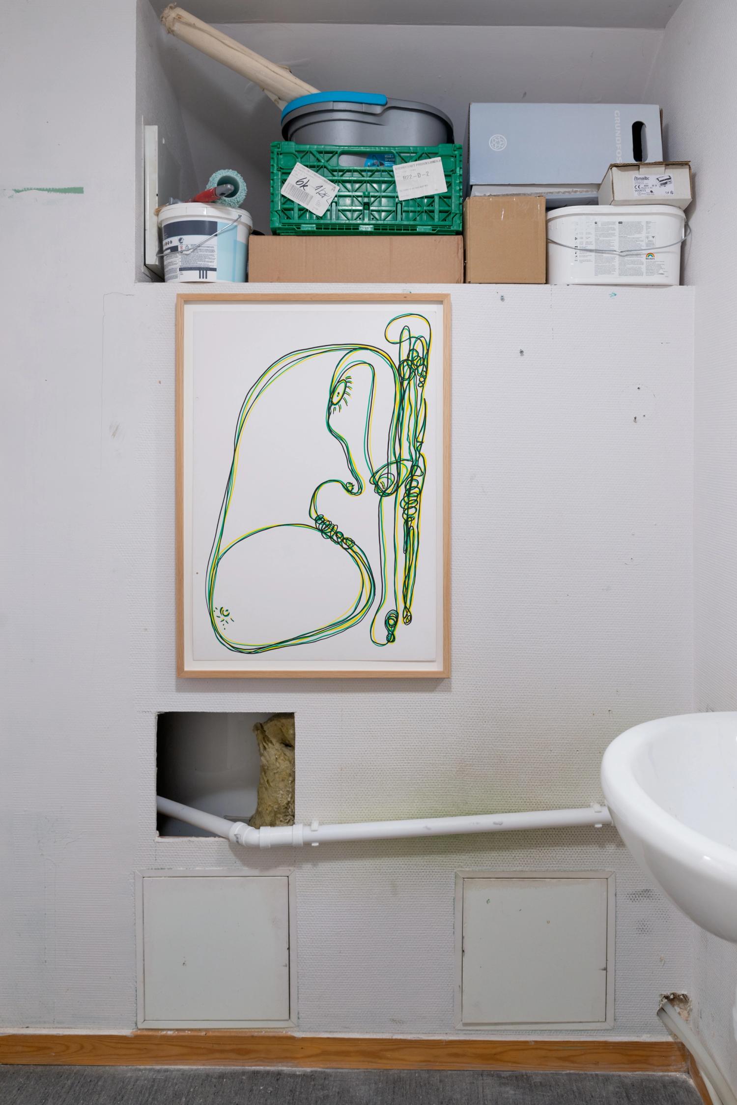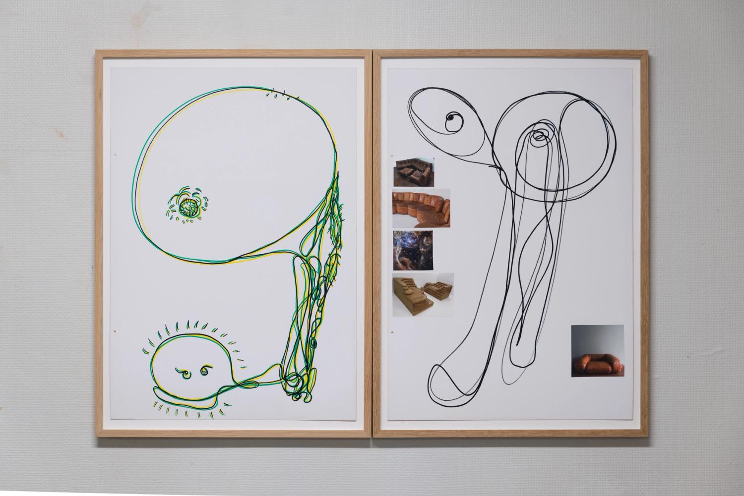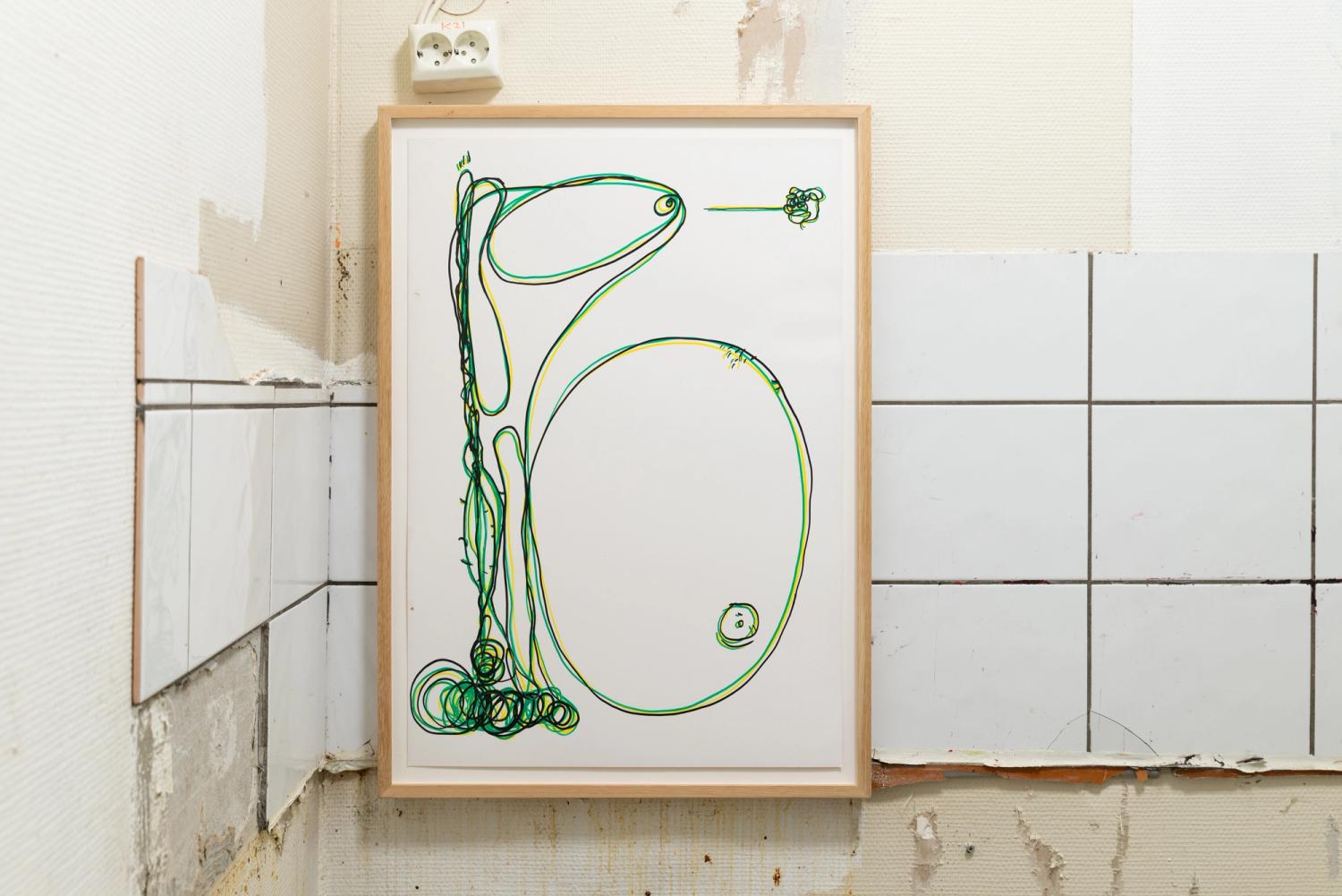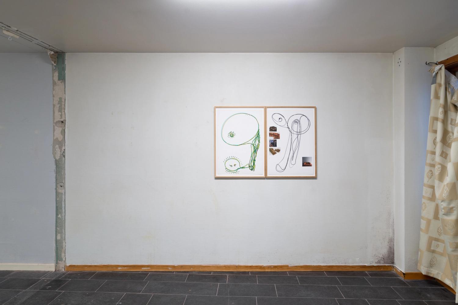 The drawings in the exhibition spring from the artist's interest in a specific form of obscene, often sexually charged, comics that were published in local variations in most Western countries in the 1980s and 90s: Python in Norway and Sweden, Myrkky in Finland, but perhaps best known internationally (though less explicit than the Nordic comics): MAD. Mortensen imagines these magazines as signs of an urge, an impulse, something overflowing from the collective subconscious.