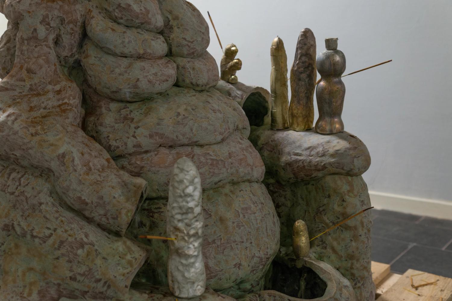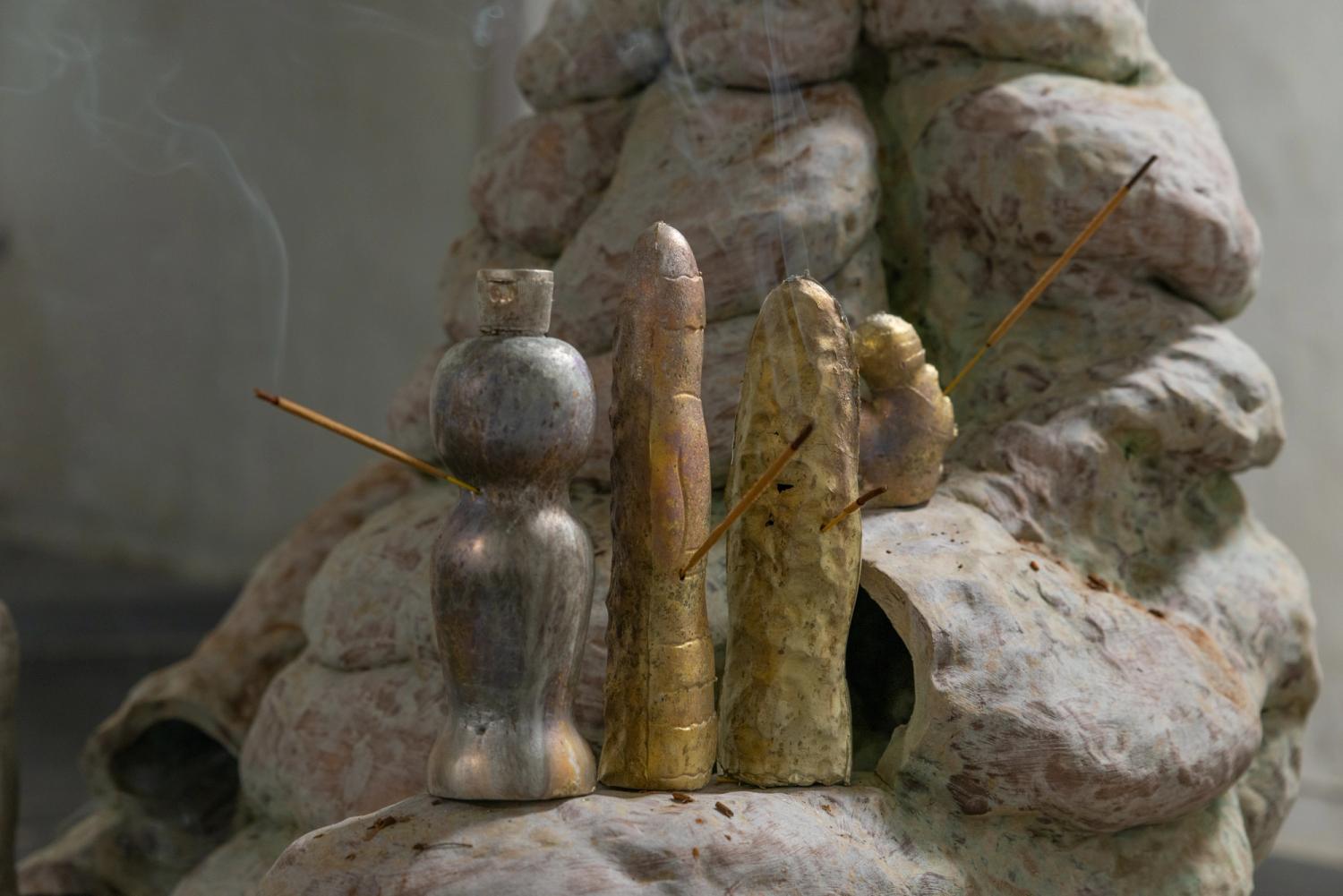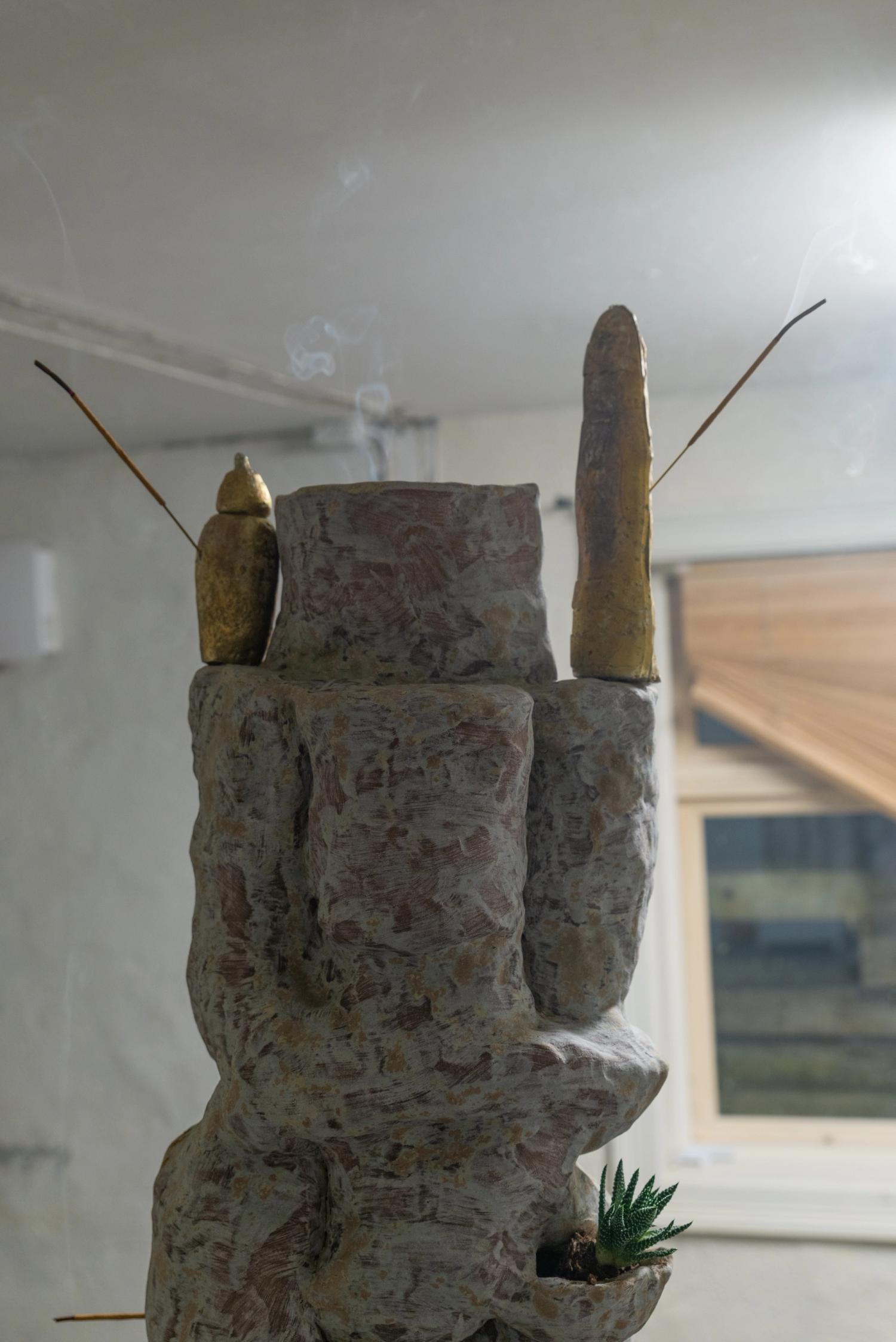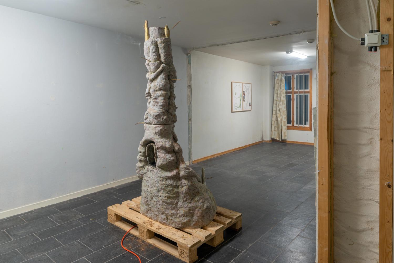 In the ceramic sculptures artist Bjørn Mortensen has worked on in recent years, he has often returned to overloading an object with potential functions. He has made sculptures that could serve as both a container, birdhouse, incense holder, fountain, flower pot and garden fireplace at the same time. These manifold functions have nevertheless only marked a potential within the objects. In the works for this exhibition, his aim has been to activate all the potentials at the same time. Using the title Feeding Fetish, Mortensen both hints at how these works may function, but also at how he himself has worked when creating them, "feeding" them with new layers, objects and functions.