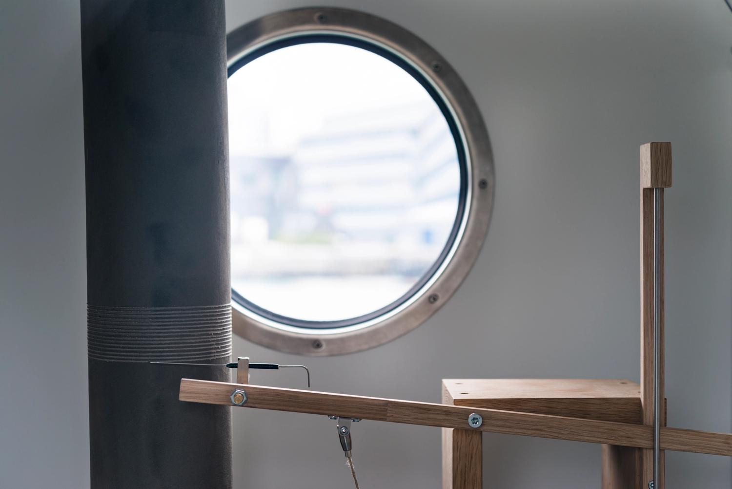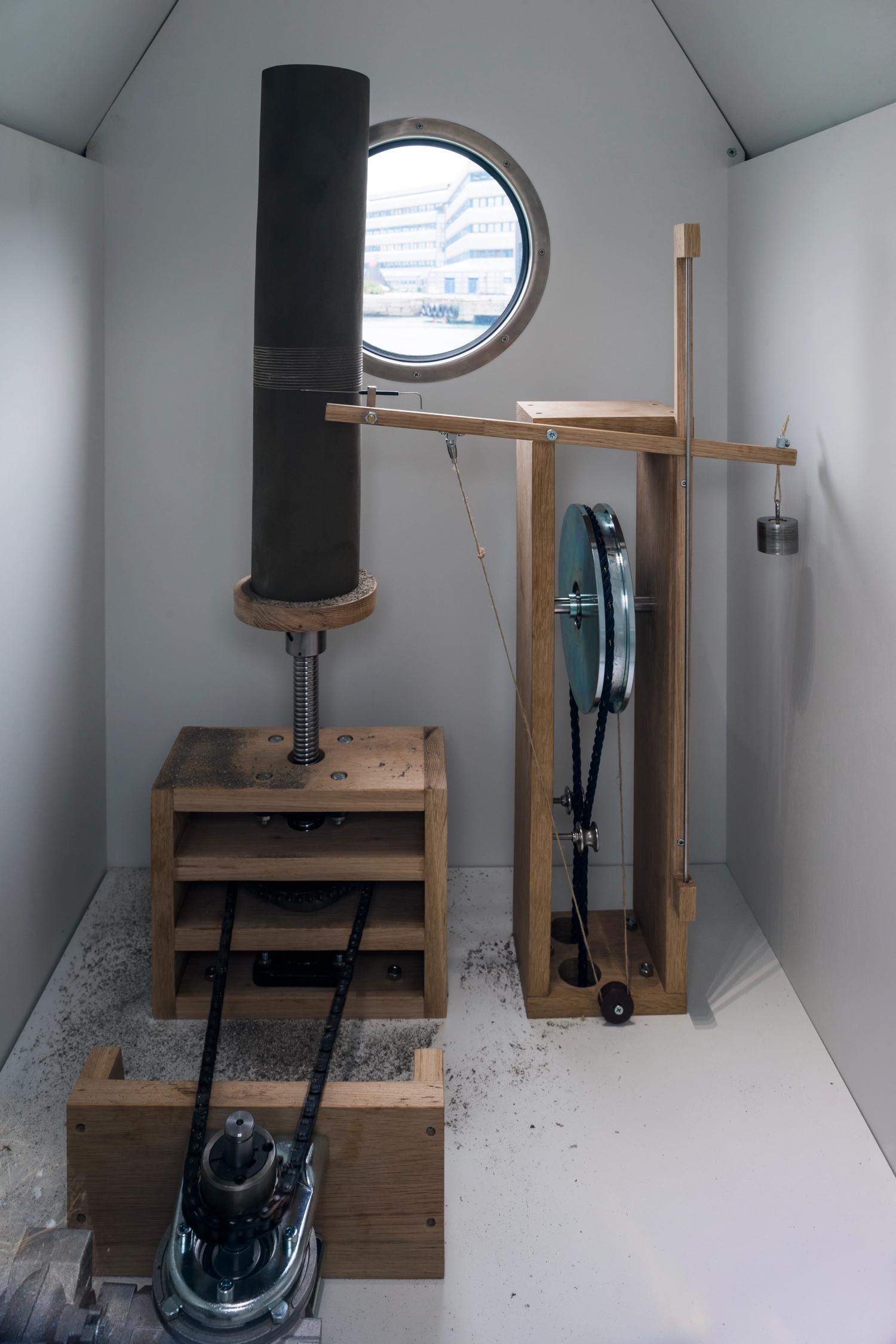 An analog mareograph (tide-gauge) placed by the fjord registers the tidewater dynamics in rotating stoneware cylinders treated with a layer of sediment isolated out from various parts of the fjord. The cylinders, which are continuously replaced during the exhibition period, will later be dried and fired ceramically, such that the clay with the specific composition of the sediment sinters* and a glaze with a unique appearance is formed.
