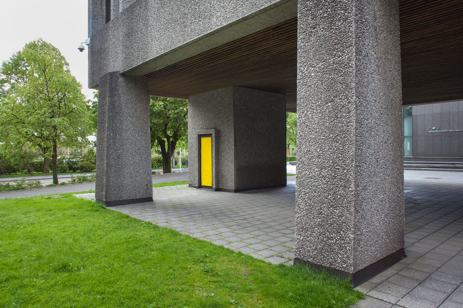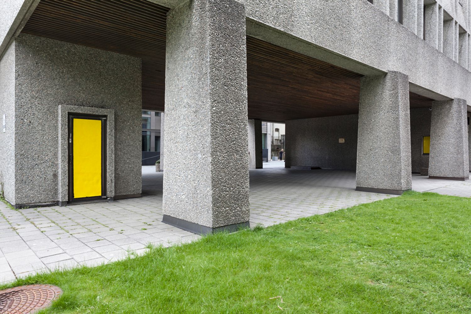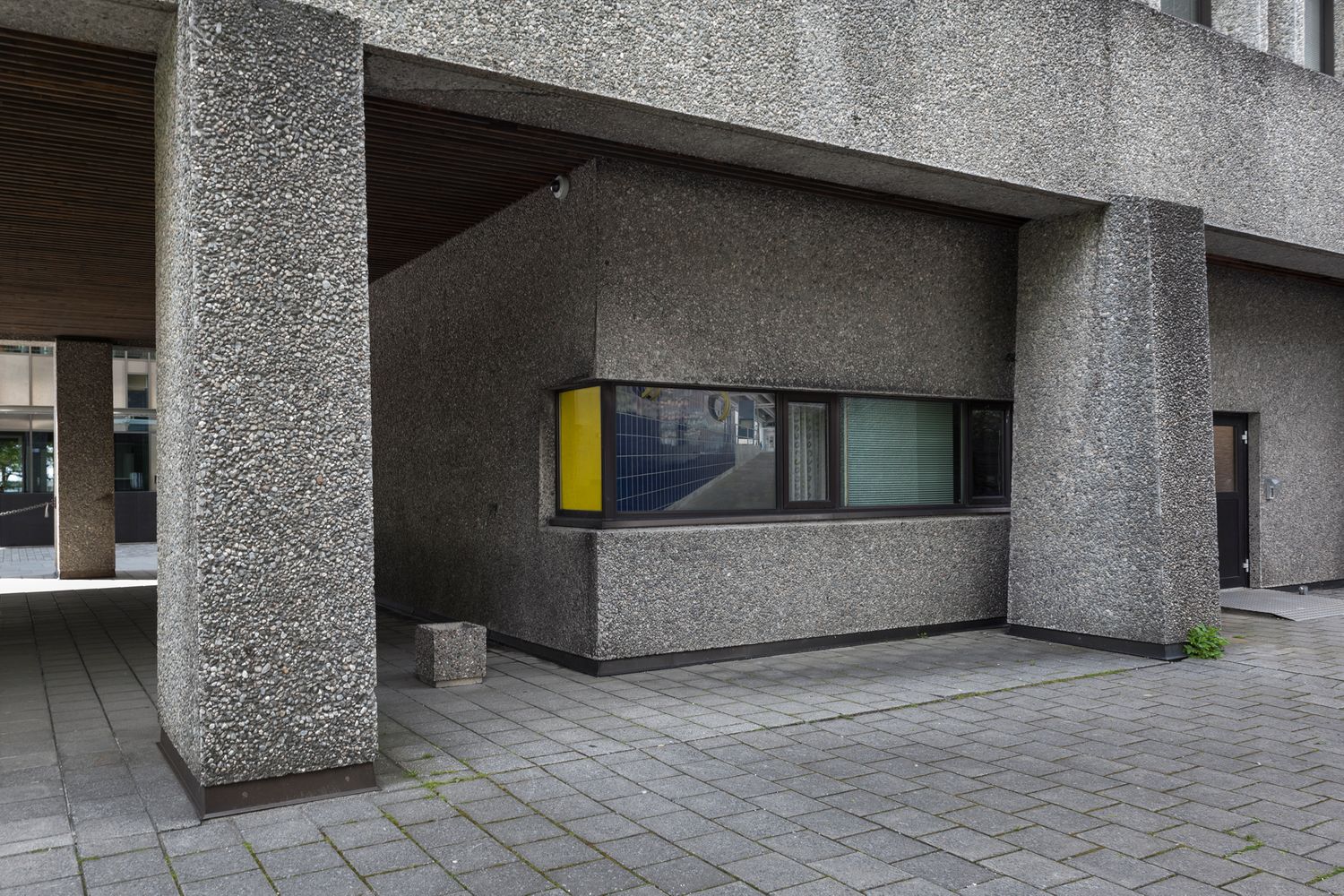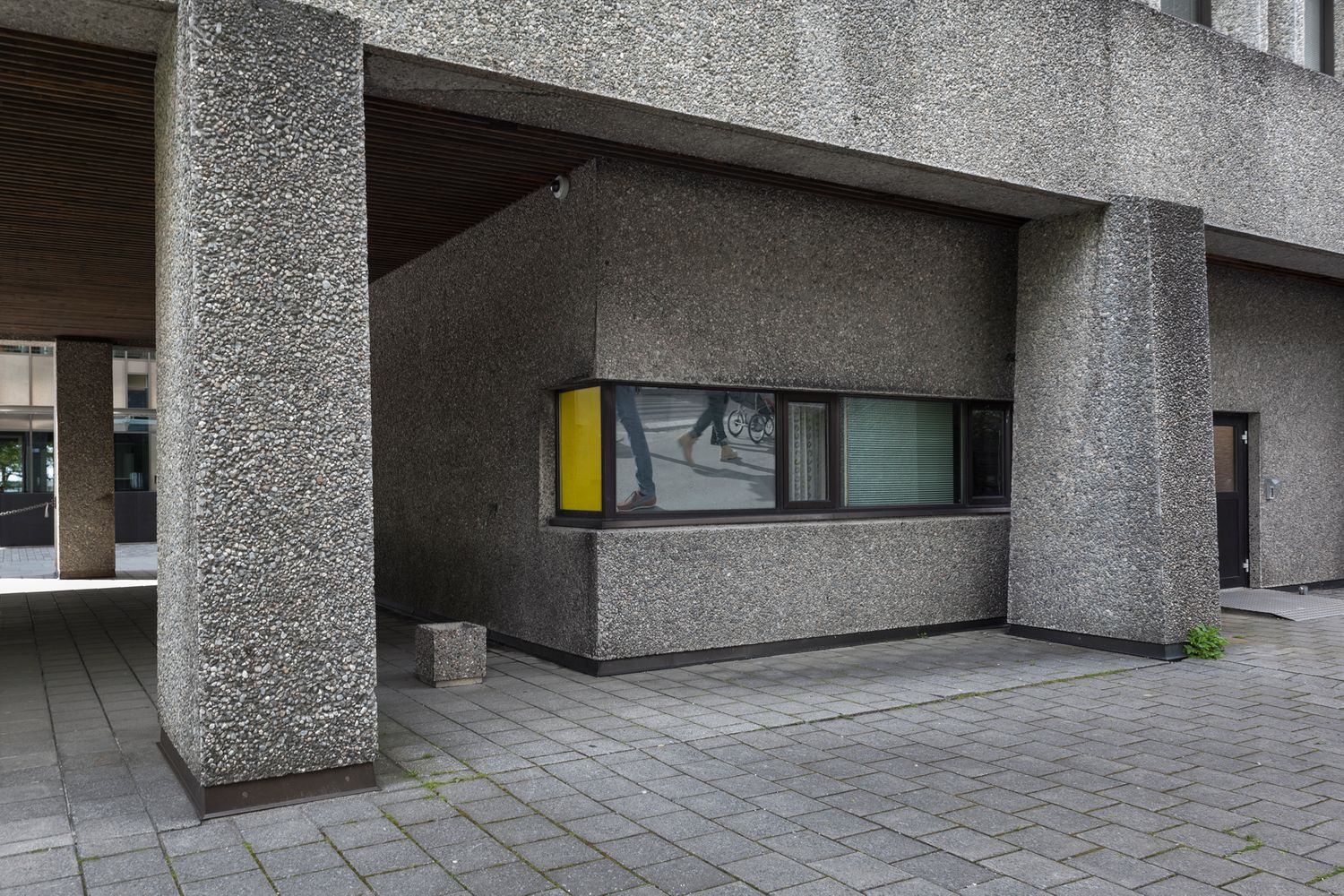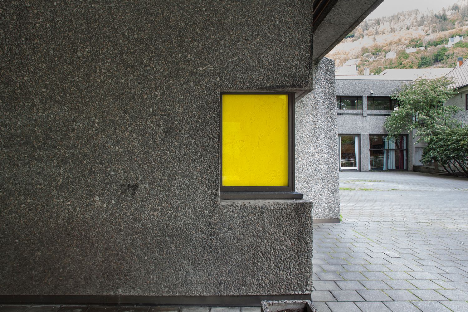 Jon Benjamin Tallerås has created three new works specifically for the square at the City Hall in Bergen. The exhibition consists of the two reliefs Béton brut (Viksjø blues) I & II, shown in one of the windows and a door in the City Hall. The video work The Seeming Disorder is shown as a back-projection on another window, and all the works can be seen from outside on the street.