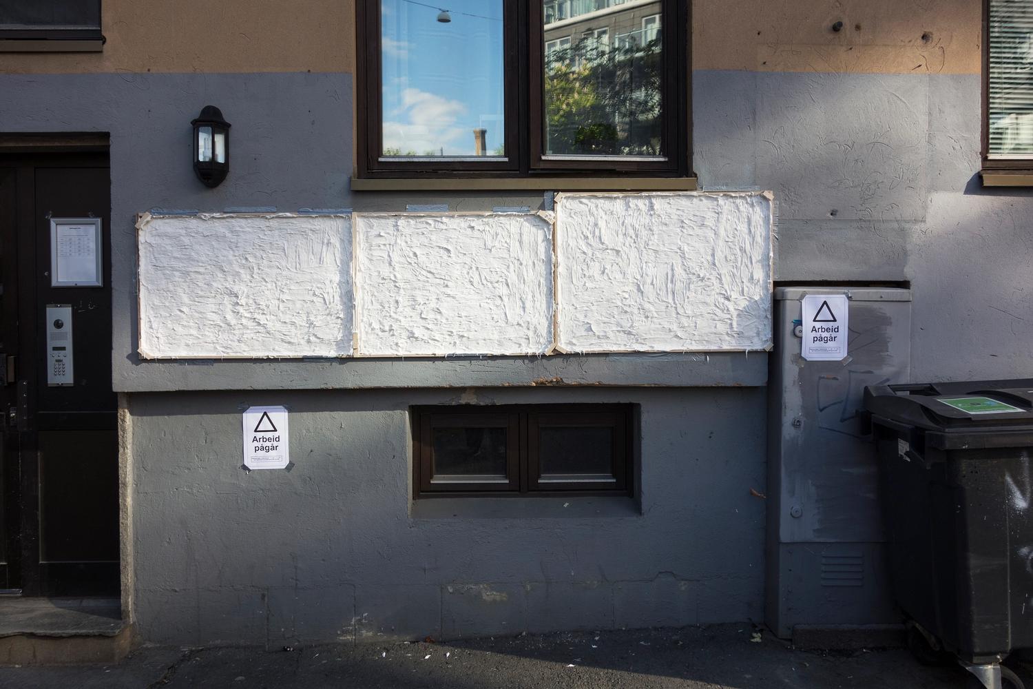The city consists of surfaces and structures that are in constant transformation, and which are sculptured by the people who live in and use the city. The patterns on the facades in Kjølberggata come from lumps in the mortar that was used when the facade was plastered. The interaction of the circular motions of the builders in the mortar was the starting point for the abstract patterns that have arisen.