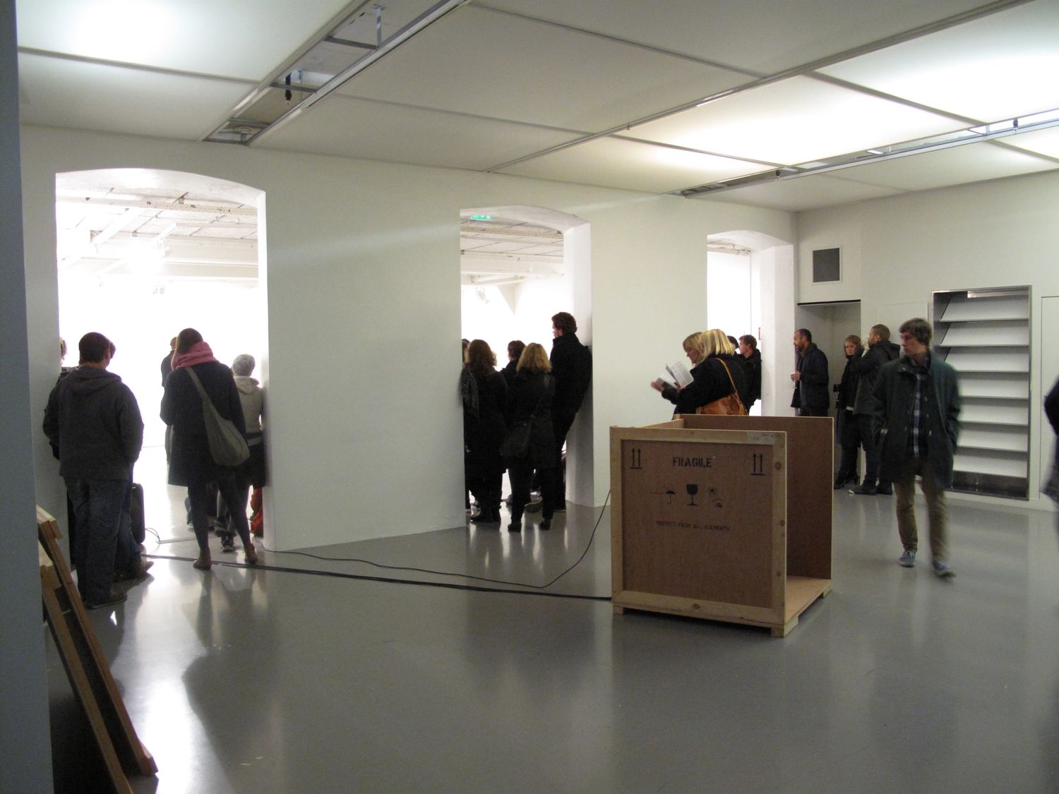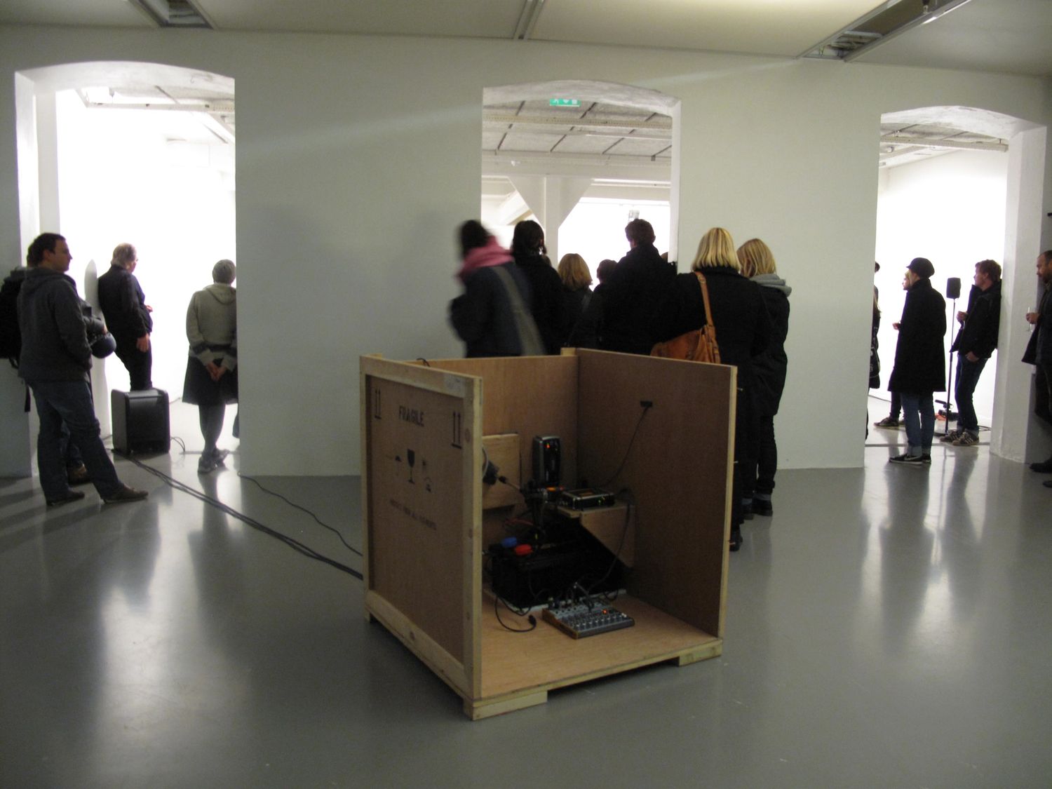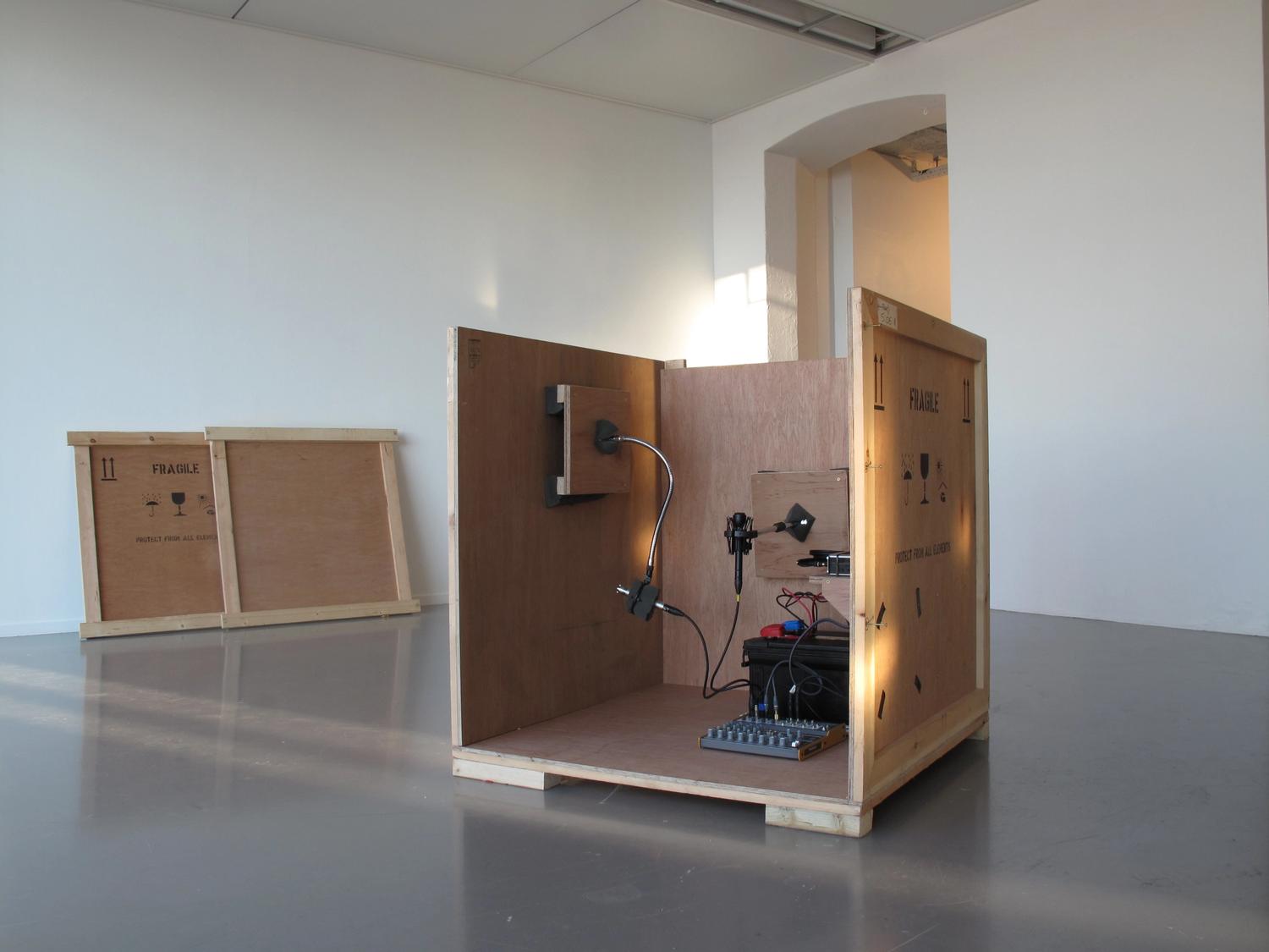 Made in part with reference to Robert Morris Box with the sound of it's own making (1961) the work is intended to extend the internalised elegance of Morris's original gesture and its implied assault on the autonomous art object, to that of a contemporary expanded field of globalised trade (exemplified by the art market). As if to extenuate its relationship to global art trade still further this essentially empty crate makes its first journey away from London simultaneously with the beginning of the Frieze art fair whereby a large proportion of the worlds contemporary art will arrive in London in identical crates. As an object and sound piece, the three and a half day field recording offers more obtuse and suggestive readings, articulated in part by the chance factors involved as to when the viewer sees and hears the work, and at which point in the journey they intercede.