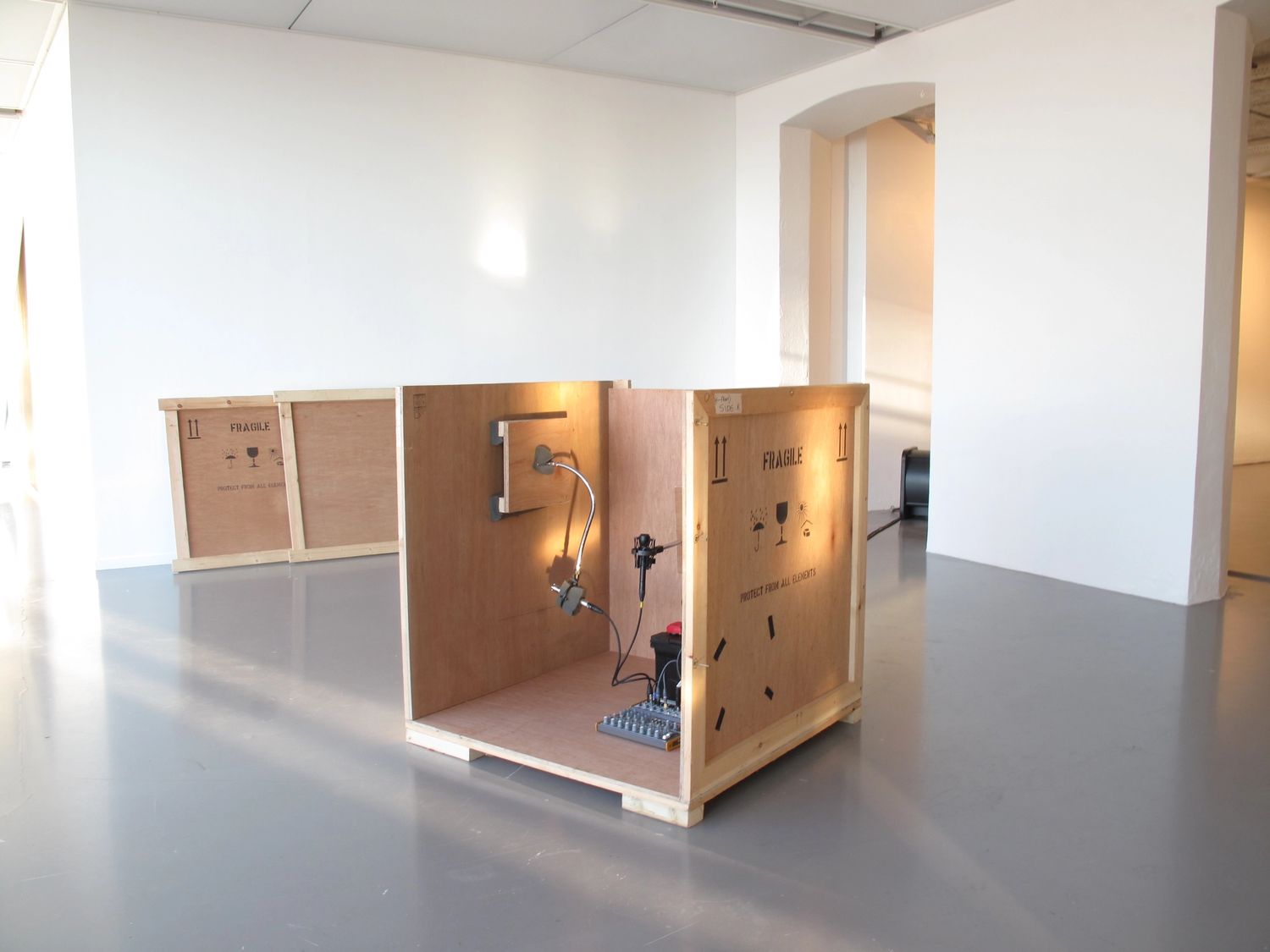 Volt is presenting a new project by Phil Coy at Gallery USF. A standard issue wooden crate, empty aside from an audio recording device and large battery is collected from the artist's studio in London and shipped via land and sea to Gallery USF in Bergen, Norway. On arrival the crate is opened out and the sound that it recorded on route is played back into the gallery space. Subsequent shows see the work made to perform its function once again, always recording and then playing back its journey as it moves from one gallery or exhibition to the next.