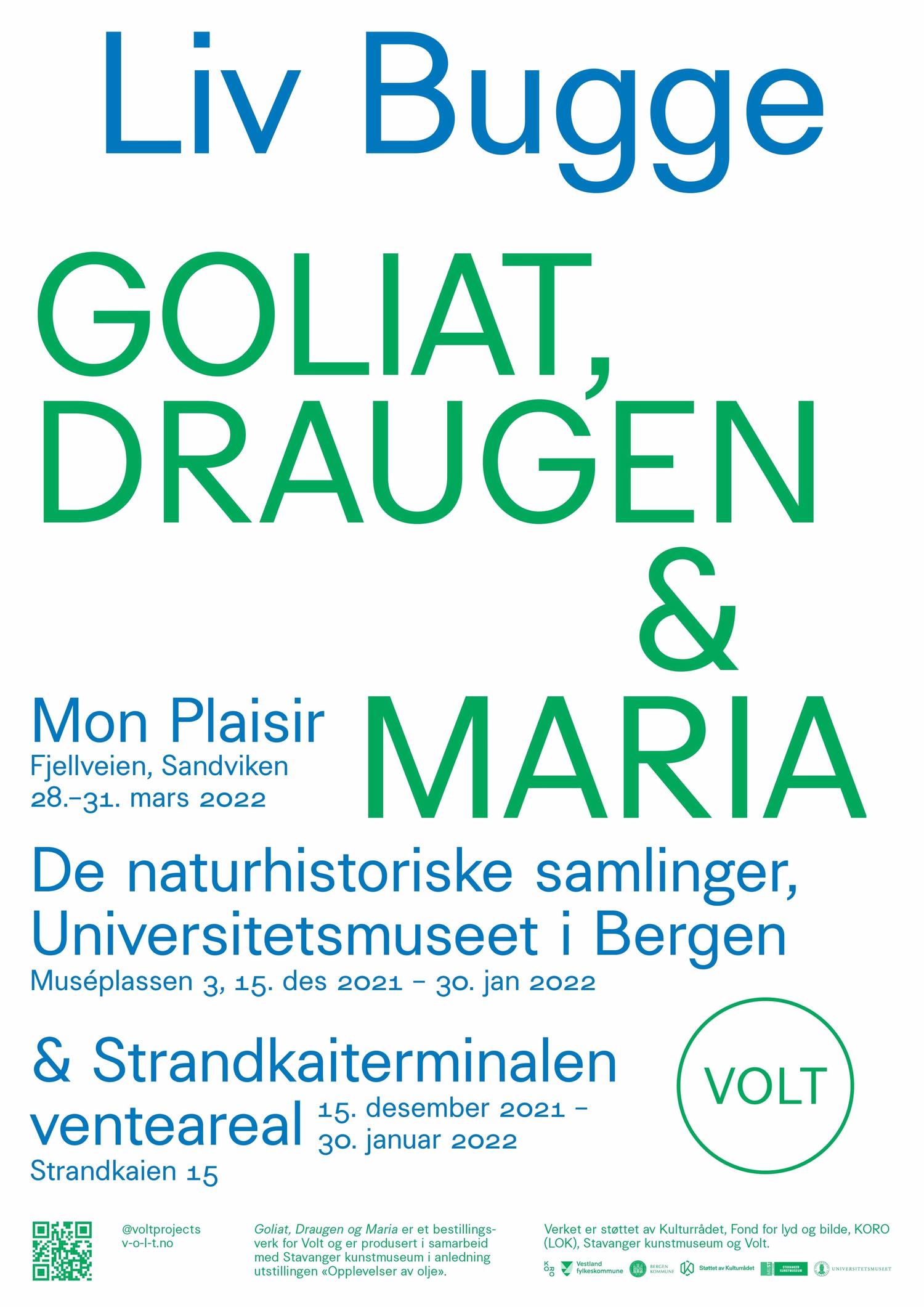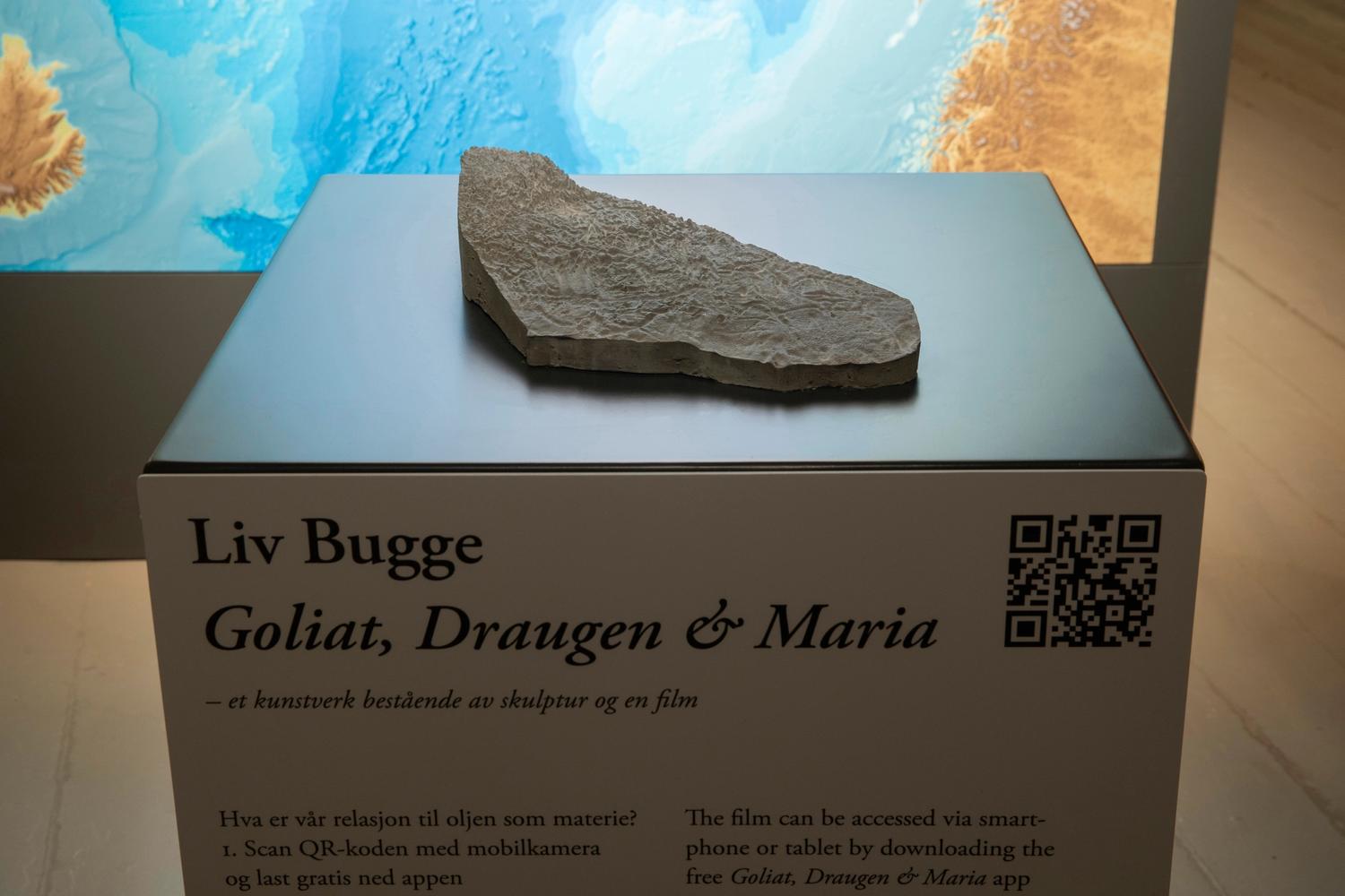 Kunstverket Goliat, Draugen & Maria består av tre skulpturer og en film. Skulpturene er støpt i betong i støpeformer laget fra 3D-printede modeller av undersjøiske landskap. Skulpturene viser havbunnens topografi (batymetri) i tre av få oljefelt på norsk sokkel med offentlig tilgjengelige geodata: Goliat i Barentshavet, og Draugen og Maria på Haltenbanken i Norskehavet. Skulpturene vises i Bergen i De naturhistoriske samlinger og i Strandkaiterminalens venteareal i desember og januar, og på Mon Plaisir i Sandviken i mars.